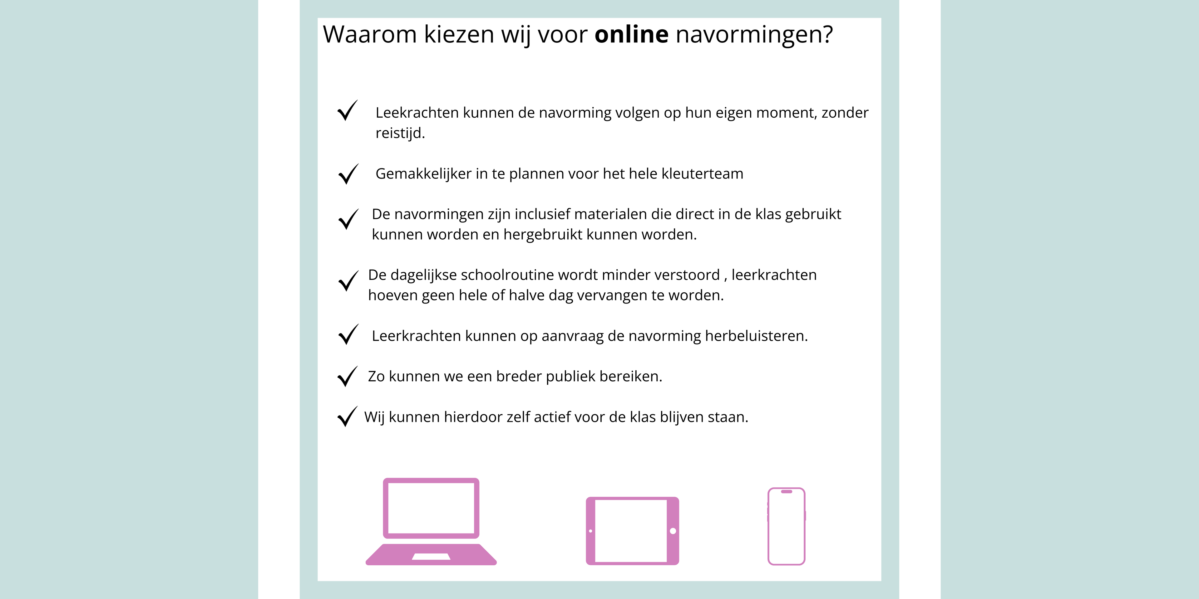 Ook wordt in veel gevallen een navorming gevolgd door één leerkracht, die vervolgens de informatie moet overdragen aan het team. Met onze online navormingen bieden we een oplossing waarmee het hele team kan deelnemen, zodat de kennis en inzichten direct met elkaar gedeeld kunnen worden.