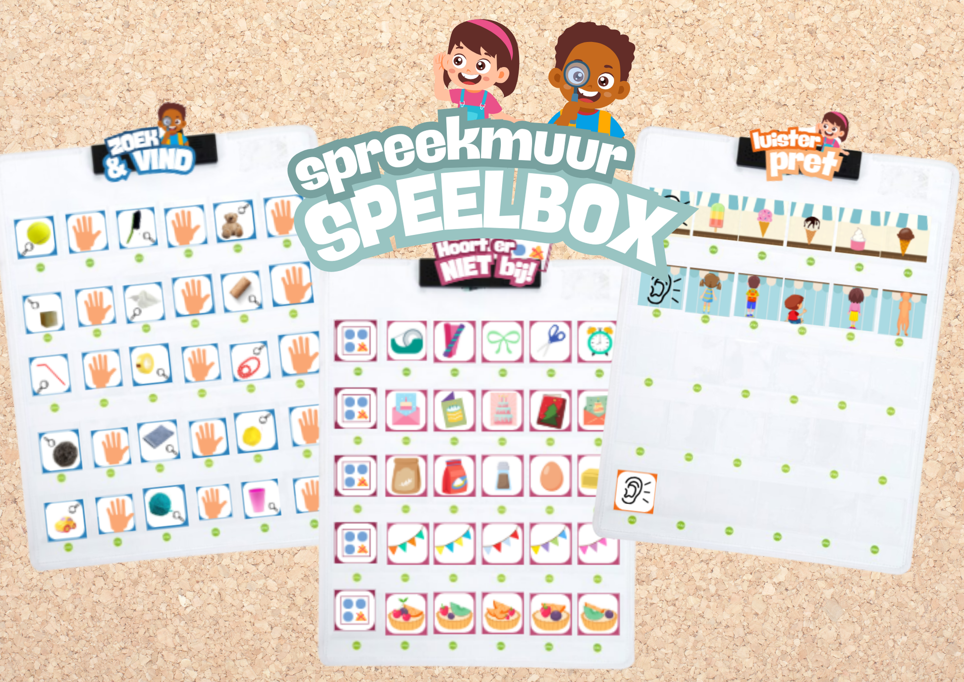 Hier ligt de nadruk meer op luisteren, maar ook dit is geen passieve werkvorm. De kinderen beluisteren een geluidsfragment en moeten het juiste kaartje bij de juiste plek op de muur hangen. Via een correctieblad kunnen ze nadien zelf controleren. Er zijn ook luisterpuzzels waarbij ze stap voor stap de spreekmuur opbouwen op basis van wat ze horen.